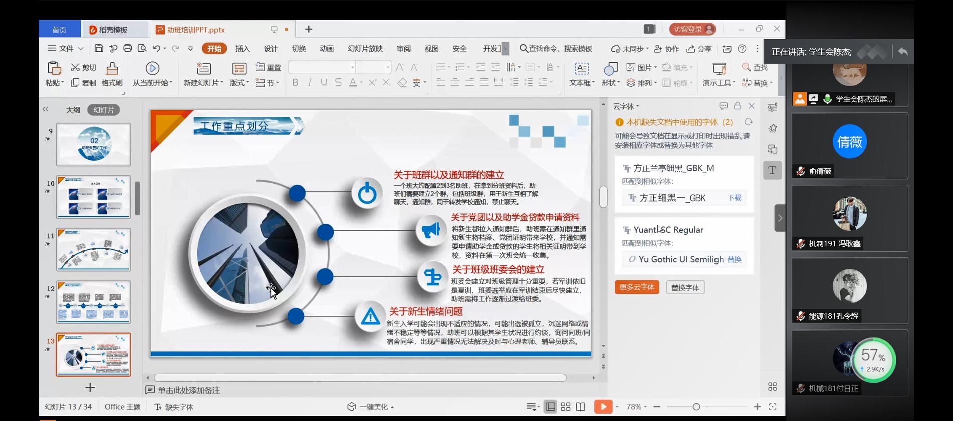 会议伊始,2020级助班工作负责人陈杰同学首先给大家简单地介绍了本次会议的流程。随后,他围绕助班工作的工作核心,强调以下几点:一是,助班应主动加强与新生交流,对新生进行积极引导;二是,助班应向新生强调学校规章制度,将严格遵守校规校纪作为工作重点;三是,助班应落实安全教育工作,持续关注新生心理健康;四是,助班应积极组织新生团建,帮助新生班级构建班委组织架构,为新生班级建设打下良好基础。最后,他希望助班们在未来工作中能够树立良好责任感,保持初心并做到尽职尽责,帮助新生快速融入大学生活。