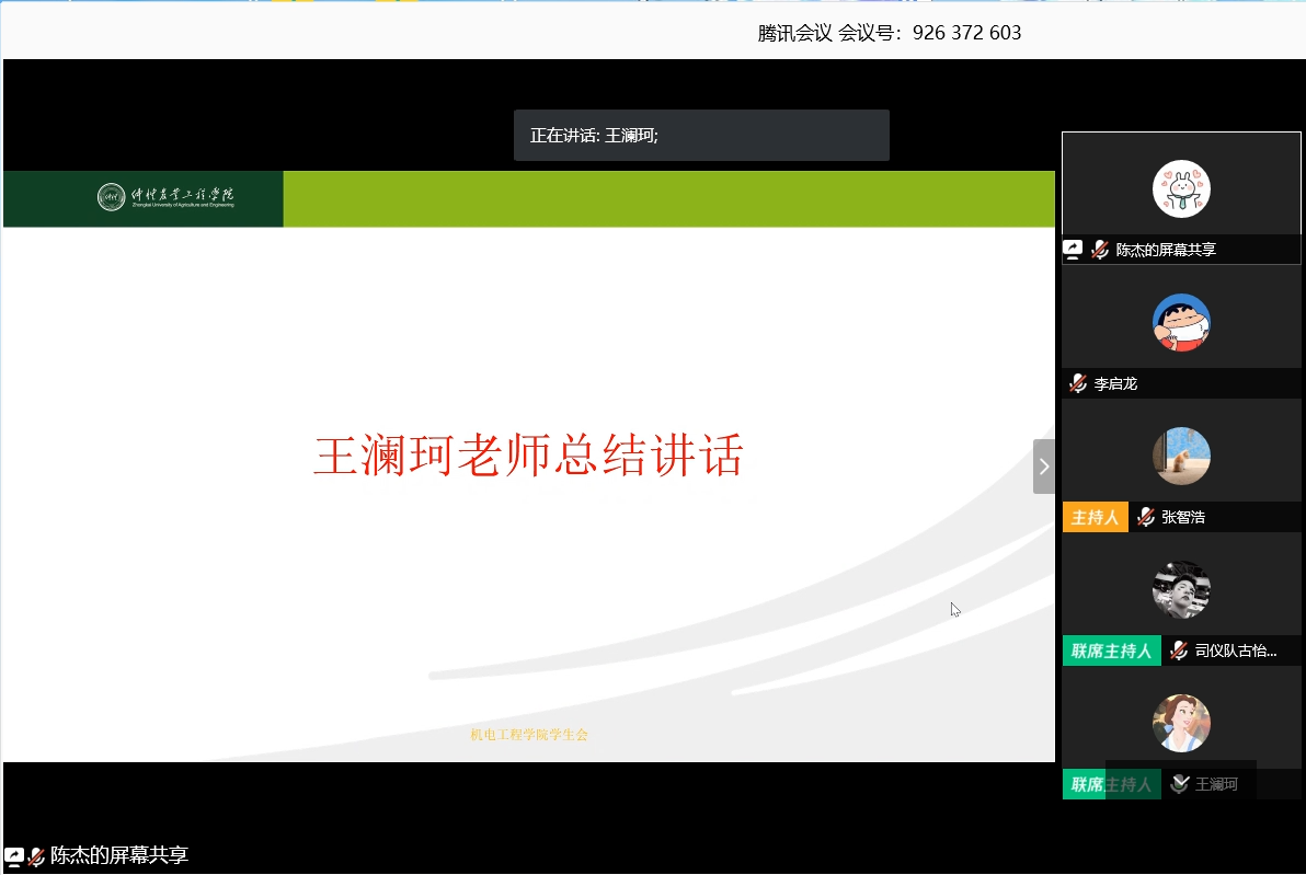 会议最后,王澜珂老师首先对学生会全体成员在疫情防控期间的辛勤付出表示衷心感谢,鼓励同学们继续保持优良作风,并要求学生会全体成员培养五种意识:一是大局意识。在疫情防控期间要带头遵守学校和学院的各项要求,听从指挥,做好每日信息汇报的工作;二是进取意识。在生活,学习,工作上积极主动地去思考,不断学习,不断思考,不断总结,并以积极进取的心态投入学生会的工作,推动学生会团体与时俱进;三是创新意识。各个部门要适当调整工作重心,打造品牌特色活动,加强常规线下活动策划转型,鼓励一系列丰富的线上活动;四是培养意识。在学生会部门工作的对接中,部长们应多加锻炼部员们,让部员有意识地去培养自身的责任与担当;五是自律意识。要处理好自身的学习问题与提高自身解决问题的能力。接着,王澜珂老师强调换届选举工作的重要性并鼓励成员们积极竞选学生会储备干部,调整自己的心态。最后,王澜珂老师强调在疫情防控期间,学生会全体成员要做好疫情期间自身的防护措施,认真对待学习,养成良好的生活习惯,牢记并担当起学生干部的职责,做到不传谣,不信谣,做好榜样和表率。