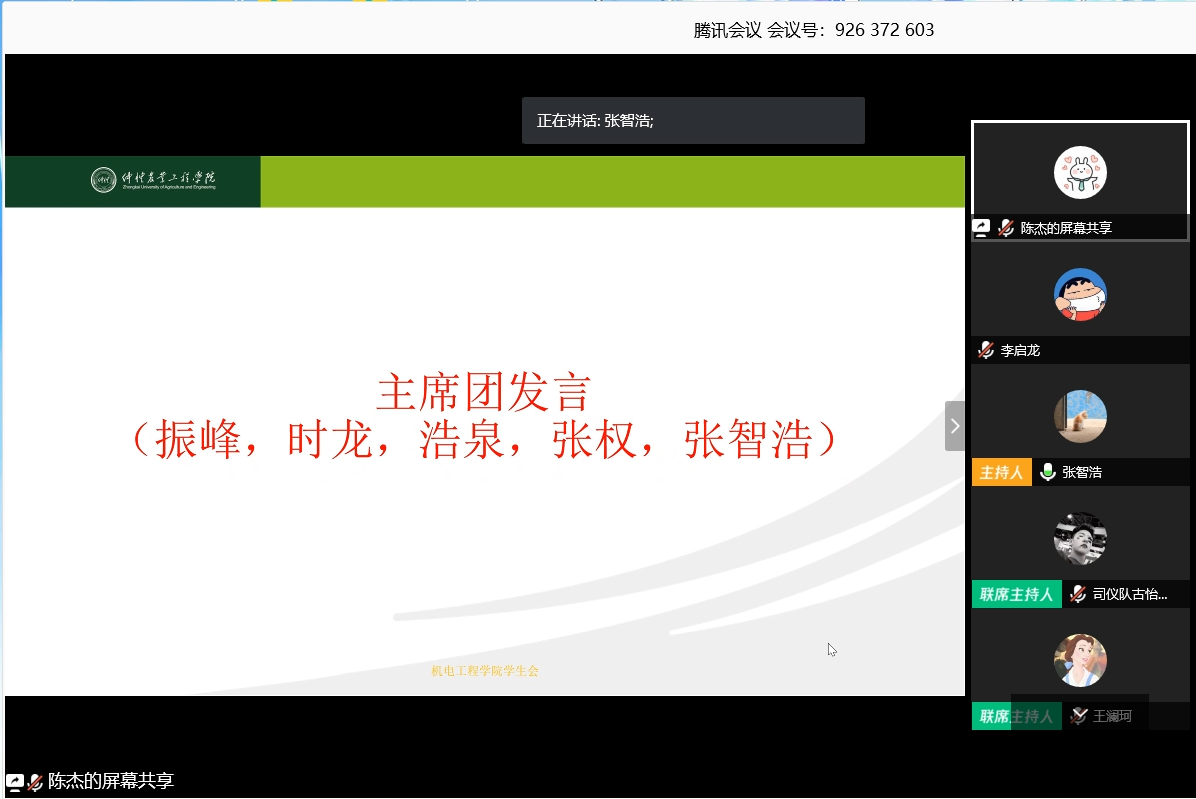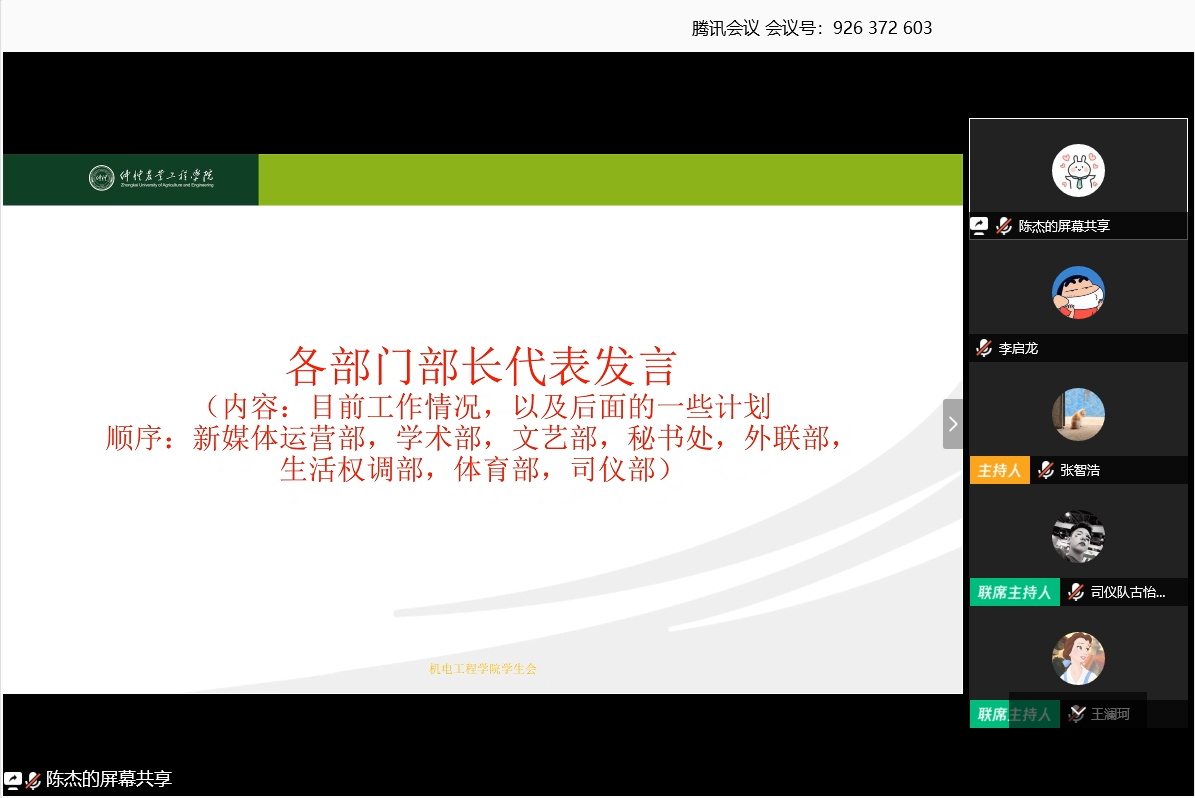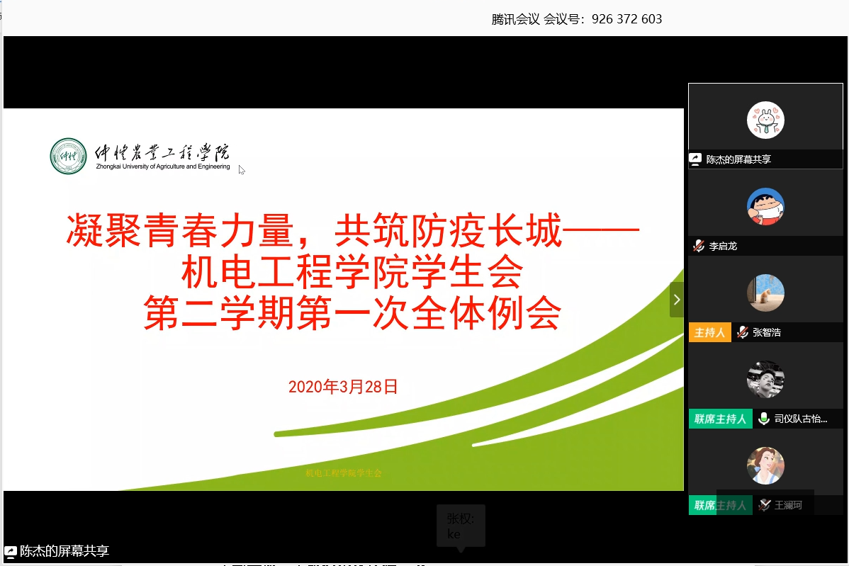为深入贯彻落实学校和学院关于疫情防控工作的各项要求,同时也为更好的协调并开展新学期工作,3月28日下午,明胜m88官网学生会利用腾讯会议召开第二学期第一次全体例会,该院辅导员,学生会指导老师王澜珂出席此次例会,学生会全体成员参加此次例会。会议由司仪队古怡乐主持。