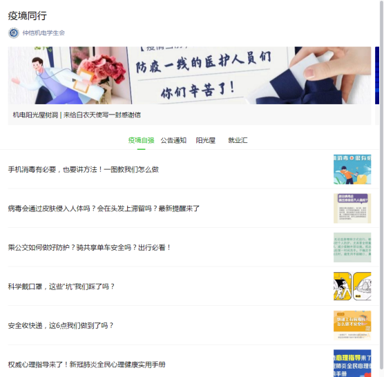据了解,明胜m88官网学生会在疫情防控期间,坚守岗位,从学生权益,文体活动,线上宣传三个方面着手,调整学生会的线上工作思路。通过微信公众号,推送 “疫”境同行等特别栏目,为同学们提供科学防疫的知识,传达学校学院各项通知,并积极筹划举办同学们喜闻乐见的活动,来丰富同学们的“第二课堂”,充分发挥了桥梁纽带作用。