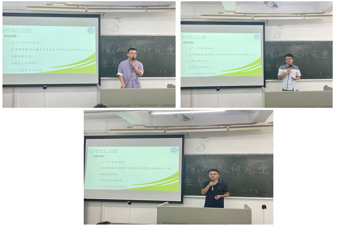 紧接着研究生导师代表唐昀超、林桂潮、徐赛博士对新生们的到来表示欢迎,同时对研究生提出了几点建议和期望:重视科研,用知识夯实自身;踏实学习,勇于求知,保持对知识孜孜不倦的学习态度,努力向上;树立远大、坚定的理想信念。
