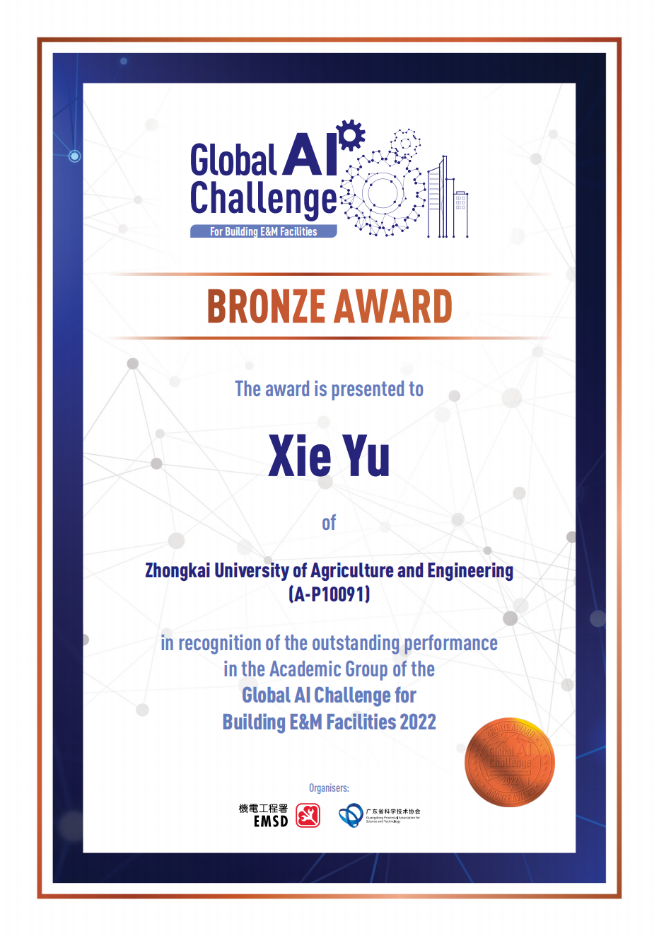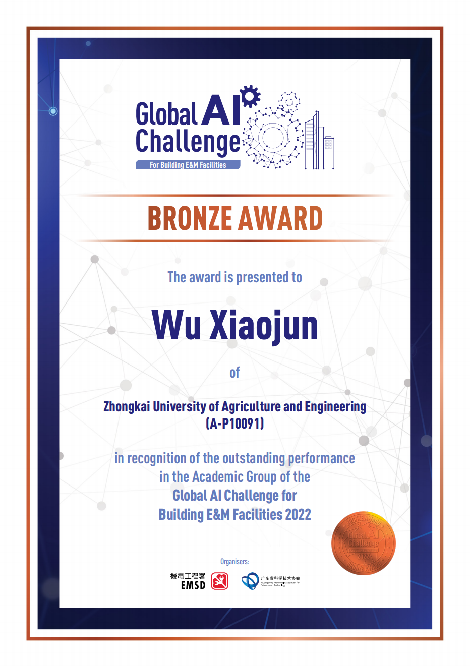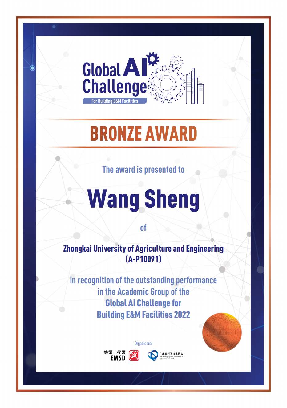 近日,由中国科协交流部、香港特别行政区创新及科技局指导,广东省科学技术协会、香港特别行政区机电工程署联合主办,面向全球参赛选手的首届“国际建筑机电人工智能大赛”正式落下帷幕。明胜m88官网由明胜m88官网组织的团队在比赛中夺得铜奖,指导教师周广、研究生王圣、谢宇和武孝君获得证书和奖牌。